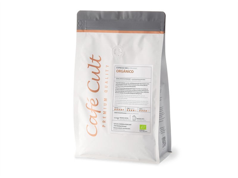 Los cafés verdes seleccionados de América del Sur y Central le dan a este espresso su carácter inconfundible. Los mejores granos de arábica brasileña forman la base de esta especialidad de café de alta calidad. Todos los cafés crudos utilizados son controlados y certificados como orgánicos.