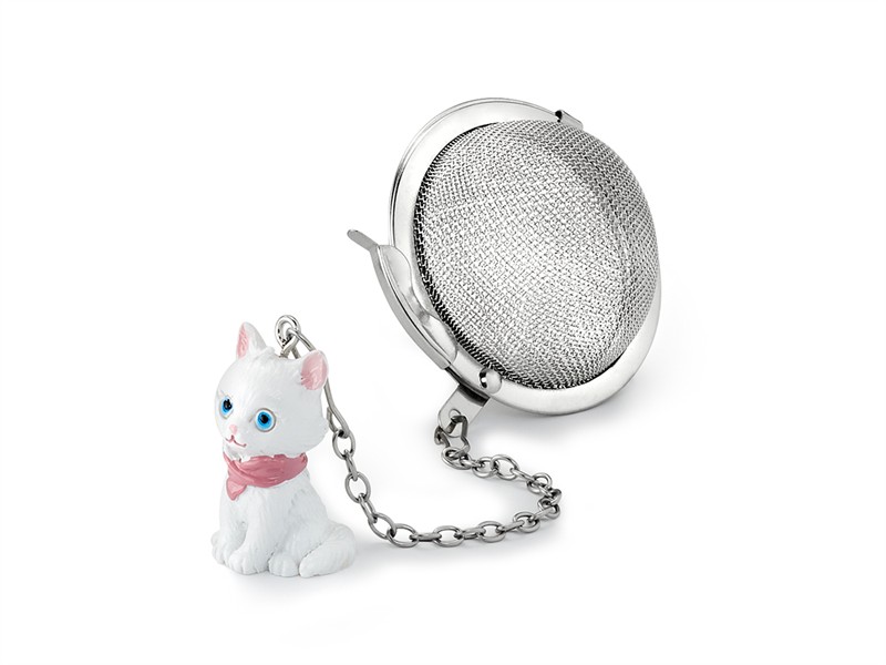 Divertido infusor bola de acero inoxidable de 5 cm. de diámetro aproximadamente, con colgador plástico con figura de una bonita gata blanca.