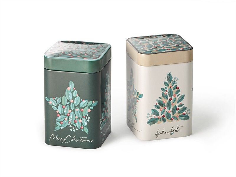 Bonita lata metálica de formas cuadradas con motivos navideños con capacidad aproximada para 100 gramos.