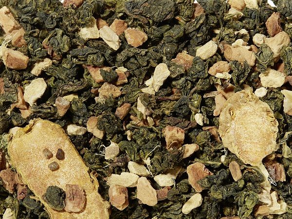 Té semifermentado (50%) Ti Kuan Yin, trozos de manzana, trocitos de jengibre, semillas de cardamomo, rodajas de cúrcuma, trocitos de canela, aroma.