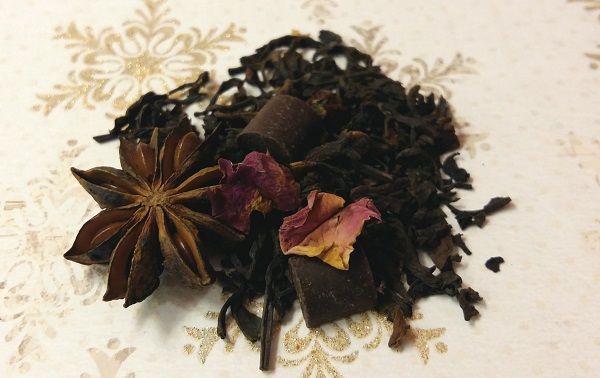 Ingredientes: Pu Erh, trozos de chocolate, uvas pasas, cardamomo, cáscara de naranja, clavo, anís estrellado, trozos de vainilla, cassia, pétalos de rosa, aromas.