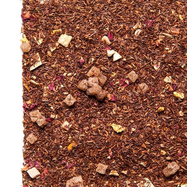 Ingredientes: Rooibos, jengibre (11%), cáscara de naranja, granulado de naranja, trozos de papaya, pétalos de rosa, aroma.