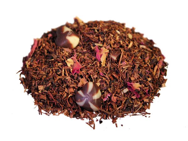 Rooibos mezclado con chocolate extrafino, y combinado con fresas, almendras, pétalos de rosa y Champagne.