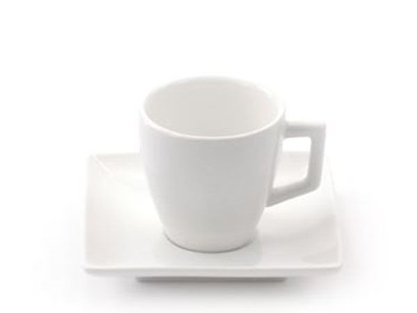 Juego en porcelana blanca de 2 tazas tamaño café con leche con el asa en forma cuadrada, acompañadas de sus correspondientes platos. Apto para lavavajillas y microondas.