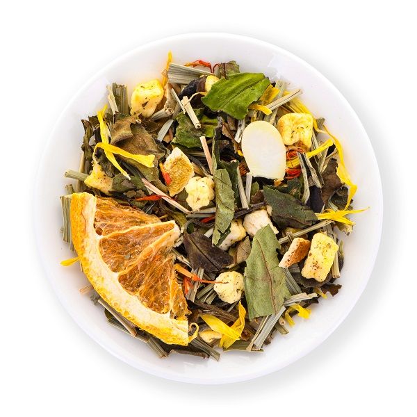 Ingredientes : té blanco, trozos de manzana blanca, hierba de limón, piel de naranja, hojas de mora dulce, aroma natural, hojas de almendro , gajos de naranja, aroma, flores de cártamo, pétalos de caléndula.