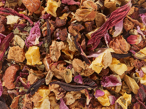 trozos de manzana*, pedacitos de jengibre* (20%), pedacitos de manzana acidulada (manzana, acidulante: ácido cítrico)*, cubitos de mango liofilizado*, flor de hibisco*, raíz de regaliz*, menta verde*, flores de rosas (5%)*, aroma, aroma natural de tonka, aceite de bergamota*, *de cultivos orgánicos controlados.