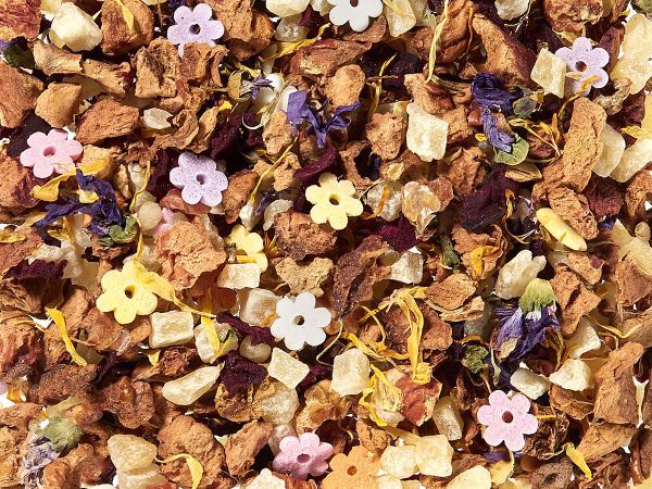 Esta infusión fue desarrollada a base del pastel de arroz japonés. Este es un dulce de «Año Nuevo» que cada vez se hace más popular. En esta infusión encanta una dulzura fina con un sabor fresco a deliciosas frambuesas, crema y un toque floral de pétalos rojos y azules. La remolacha asegura un color brillante en la taza. Visualmente convence esta creación, con jugetonas y coloridas flores de azúcar, flores de malva y caléndula.