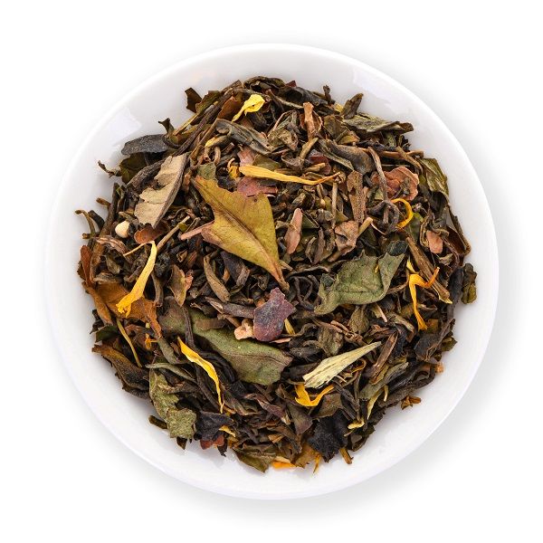 Ingredientes: té verde (41%), té blanco(20%), cáscaras de cacao, aroma, trozos de aloe vera (Aloe vera, azúcar, antioxidante: metabisulfito de sodio (SO2)), avellanas crocantes (azúcar, avellanas, jarabe de azúcar de caramelo), pétalos de caléndula.