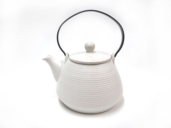 Tetera de cerámica de 0.65 litros de capacidad, dotada de infusor de acero inoxidable y asa metálica.