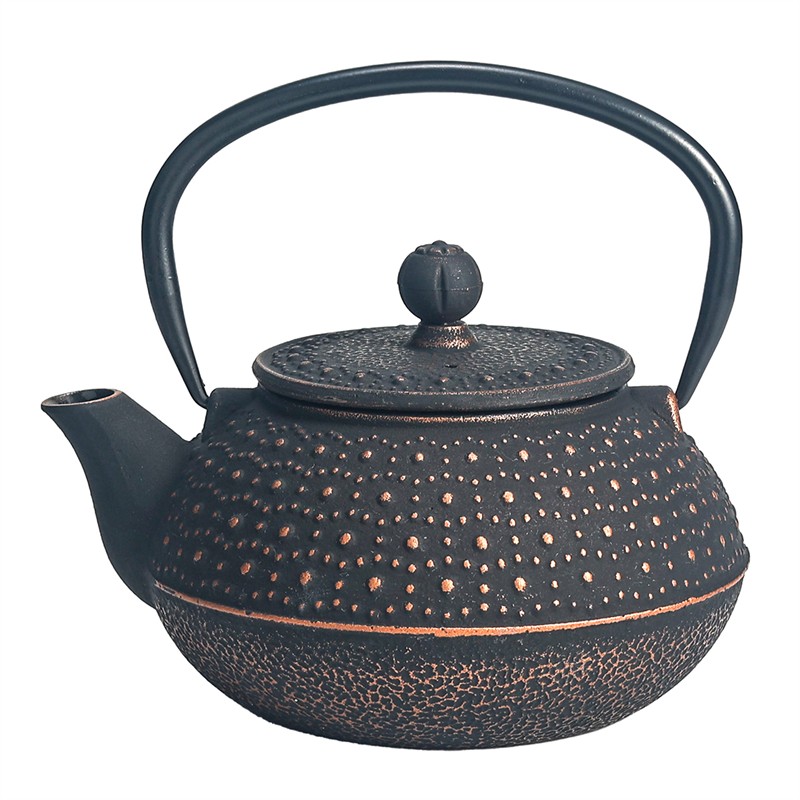 Tetera de hierro fundido (Tetsubin) de 0,8 litros de capacidad, con recubrimiento interior porcelánico. Color negro/cobre. Dotada de infusor de acero inoxidable.