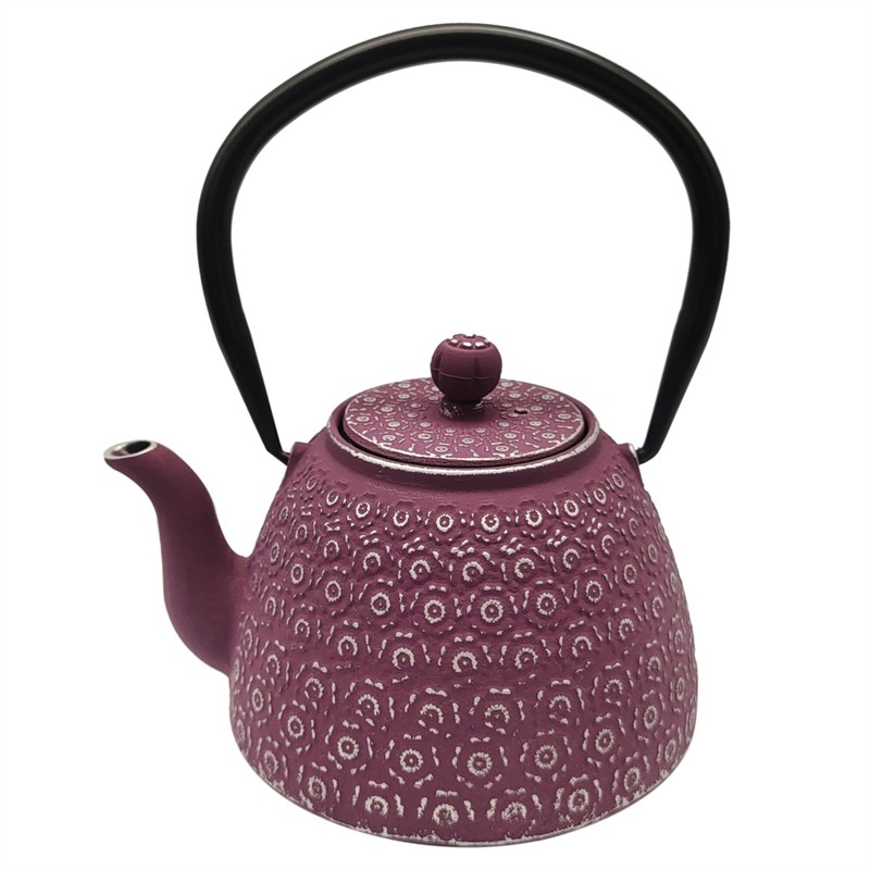 Tetera de hierro fundido (Tetsubin) de 0,6 litros de capacidad, con recubrimiento interior porcelánico. Color morado/plata. Dotada de infusor de acero inoxidable.