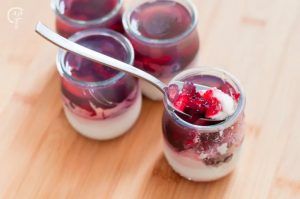 Una vez la gelatina de yogur haya cuajado un poco, escurrir las cerezas y repartirlas a partés iguales. Con el jugo que habrán soltado se puede teñir la gelatina de té, o repartirlo entre los vasitos de forma que sólo tiña la parte inferior de la gelatina cuando la vertamos.